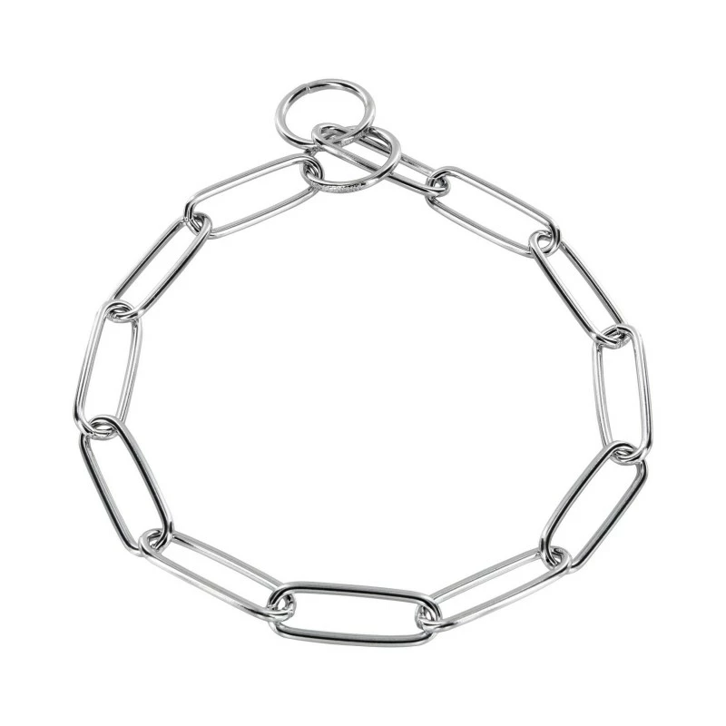 Cette chaine simple à maillons extra longs passe parfaitement à travers l’anneau en métal en raison de son diamètre de 3,4 mm et de sa forme rectangulaire. Peut servir de collier étrangleur pour l’apprentissage de la marche au pied. Ce collier vous aide notamment à reprendre les rênes de la promenade de façon sécuritaire et rythmé en faisant comprendre à votre fidèle compagnon qu’il n’a pas besoin de tirer sur la laisse pour avancer. Il a notamment pour but d’entrainer un inconfort chez le chien en lui envoyant un signal non-douloureux, mais désagréable lorsqu’il tire sur sa laisse.