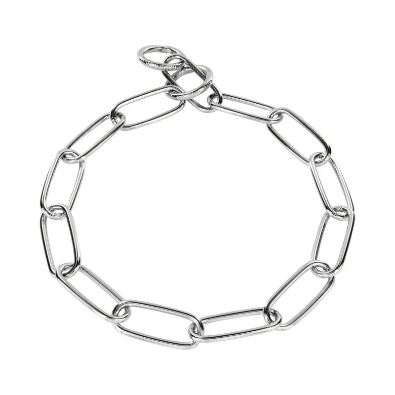 Cette chaine simple à maillons extra longs passe parfaitement à travers l’anneau en métal en raison de son diamètre de 4 mm et de sa forme rectangulaire. Peut servir de collier étrangleur pour l’apprentissage de la marche au pied. Ce collier vous aide notamment à reprendre les rênes de la promenade de façon sécuritaire et rythmé en faisant comprendre à votre fidèle compagnon qu’il n’a pas besoin de tirer sur la laisse pour avancer. Il a notamment pour but d’entrainer un inconfort chez le chien en lui envoyant un signal non-douloureux, mais désagréable lorsqu’il tire sur sa laisse.