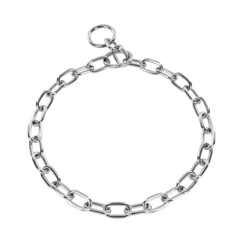 Cette chaine simple à maillons longs passe parfaitement à travers l’anneau en métal en raison de son diamètre de 3,4 mm et de sa forme rectangulaire. Peut servir de collier étrangleur pour l’apprentissage de la marche au pied. Ce collier vous aide notamment à reprendre les rênes de la promenade de façon sécuritaire et rythmé en faisant comprendre à votre fidèle compagnon qu’il n’a pas besoin de tirer sur la laisse pour avancer. Il a notamment pour but d’entrainer un inconfort chez le chien en lui envoyant un signal non-douloureux, mais désagréable lorsqu’il tire sur sa laisse.