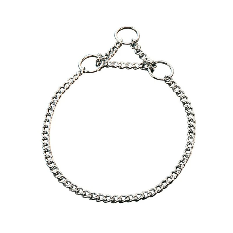 Cette chaine simple à maillons ronds de 1,5 mm d’épaisseur est rattachée à une chaîne de montage constituée de trois anneaux soudés. Ce collier à traction limitée peut servir de collier semi-étrangleur pour l’apprentissage de la marche au pied à votre jeune chien. Il vous aide notamment à reprendre les rênes de la promenade de façon sécuritaire en faisant comprendre à votre fidèle compagnon qu’il n’a pas besoin de tirer sur la laisse pour avancer. Ce collier a notamment pour but d’entrainer un inconfort chez le chien en lui envoyant un signal non-douloureux, mais désagréable lorsqu’il tire sur sa laisse.