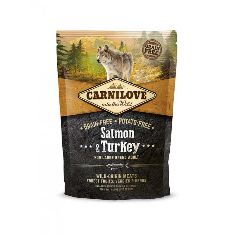 Ces croquettes sans céréales et sans pomme de terre sont proposées par la marque Carnilove comme un aliment complet spécialement élaboré pour répondre aux besoins nutritionnels des chiens adultes de grandes races (+ de 25 kg). Formulée à partir de viande de dinde et de saumon, cette alimentation digeste et équilibrée aide à renforcer les os et les articulations et améliore la qualité et l’aspect de la peau et du poil du chien.