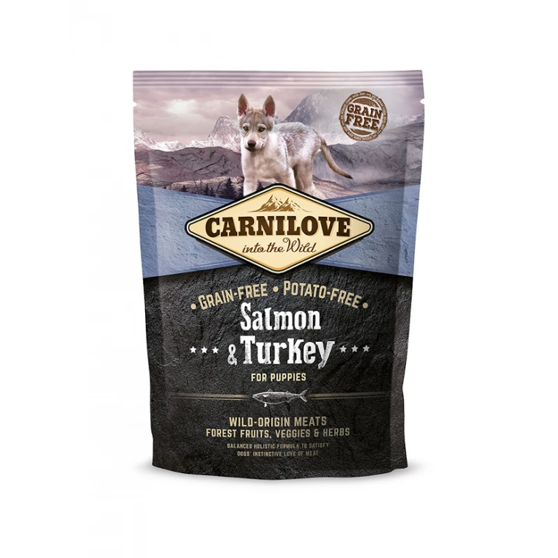 Ces croquettes sans céréales et sans pomme de terre sont proposées par la marque Carnilove comme un aliment complet spécialement élaboré pour répondre aux besoins nutritionnels des chiots de toutes races âgés de 1 à 12 mois. Formulée à partir de viande de dinde et de saumon, cette alimentation digeste et équilibrée aide à renforcer les os et les articulations pour une bonne croissance et améliore la qualité et l’aspect de la peau et du poil du chiot.