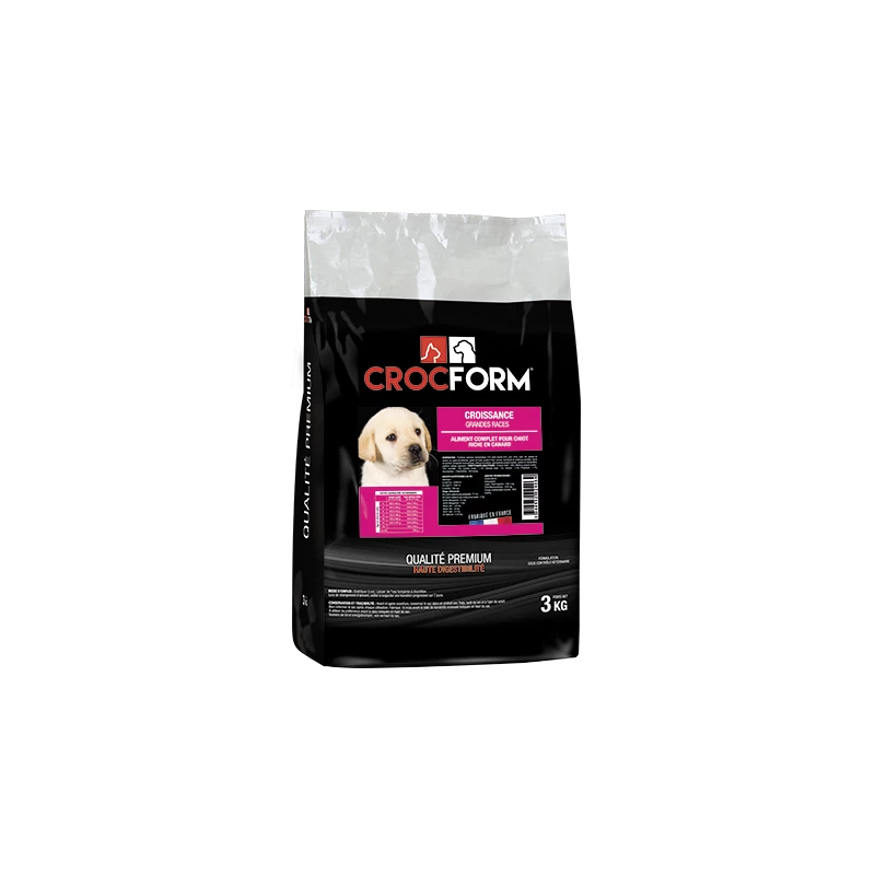 Ces croquettes d’origine française sont proposées par la marque CROCFORM dans sa gamme Premium comme un aliment complet pour chiots en développement de grandes races. Hautement digestible et croquante, la nourriture CROISSANCE au bon goût de canard et de porc conviendra parfaitement comme alimentation quotidienne pour votre jeune chien.