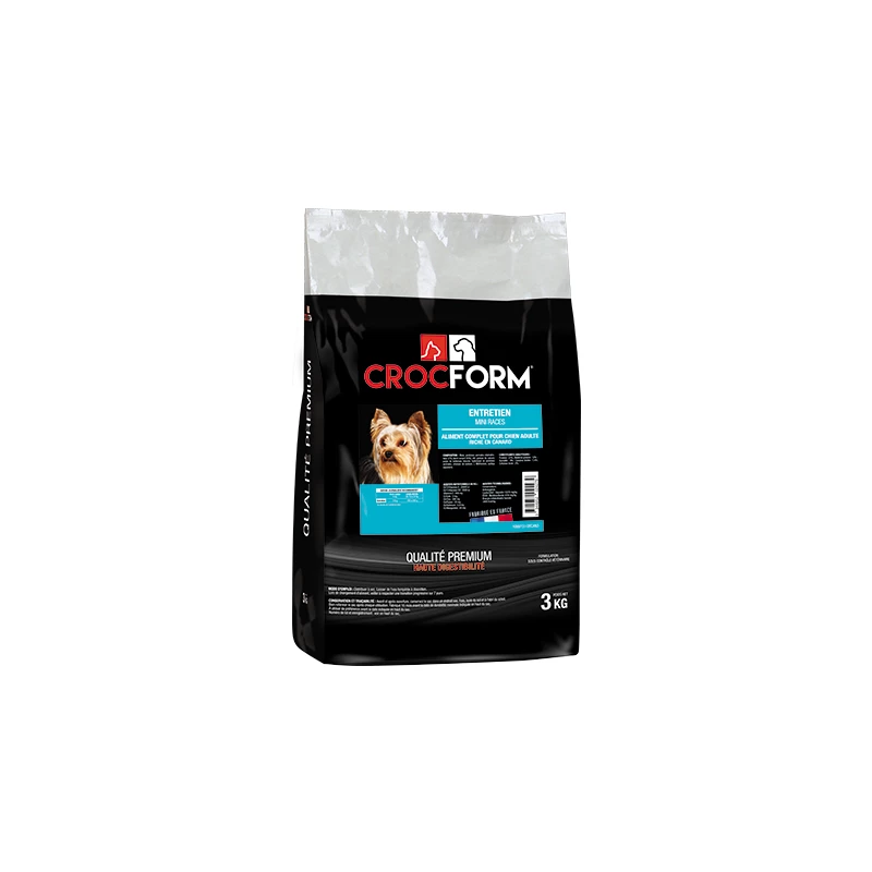 Ces croquettes d’origine française sont proposées par la marque CROCFORM dans sa gamme Premium comme un aliment complet pour chiens adultes de très petites races. Hautement digestible et croquante, la nourriture ENTRETIEN au bon goût de canard et de porc conviendra parfaitement comme alimentation quotidienne pour votre compagnon canin.