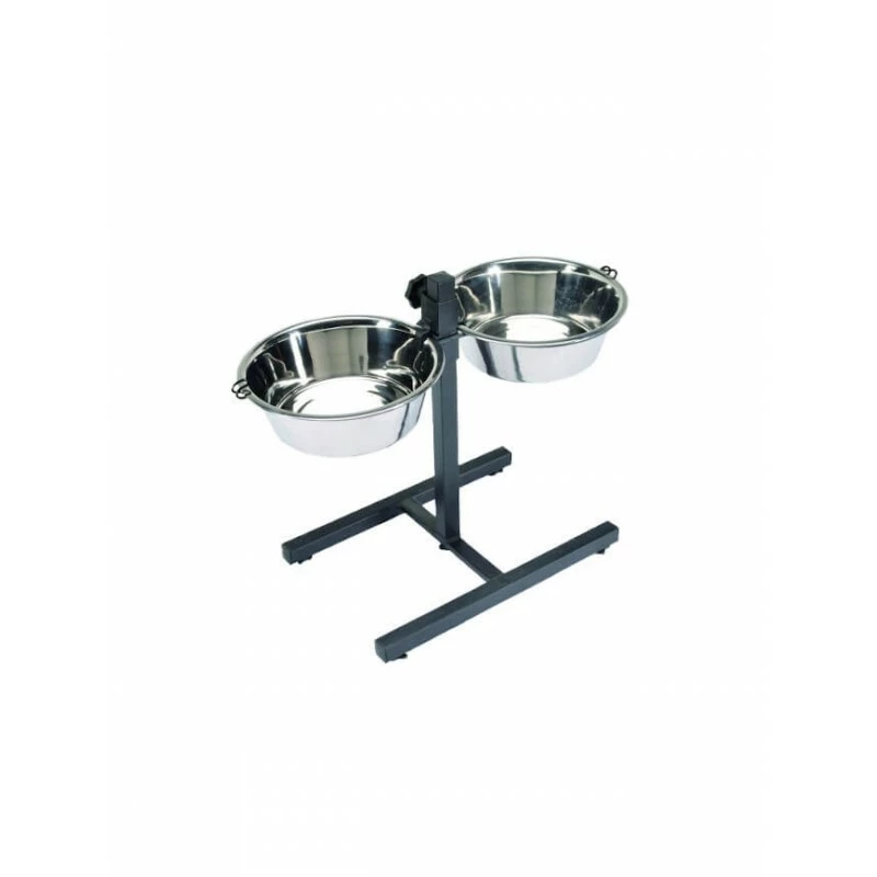 Porte-gamelles résistant en acier offrant la possibilité de régler la hauteur des écuelles (en inox) afin qu’il adopte une meilleur position pour se nourrir ou se désaltérer. Capacité : 2 x 900 ml – Diamètre : 16 cm.
