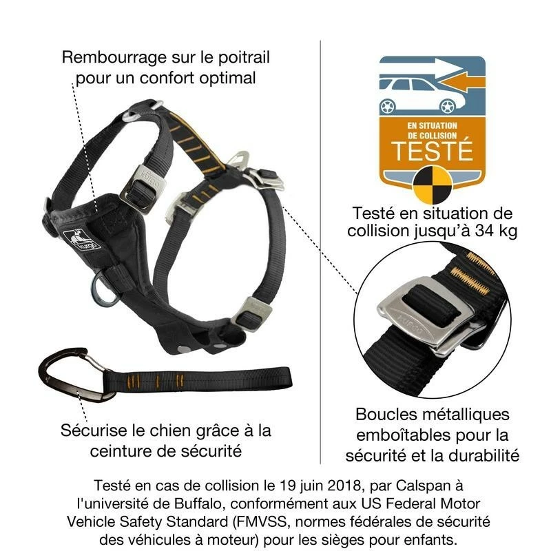 Ce produit est proposé par la marque Kurgo comme un harnais de sécurité pour chien de tous âges. Idéal pour garantir la sécurité du chien lors des trajets en voiture, ce harnais est fabriqué à partir de matériaux inspirés des équipements d’escalade. Confortable et résistant, il a été homologué pour une résistance aux chocs pour les chiens jusqu’à 34 kg selon les mêmes normes que les systèmes de retenues pour les enfants.