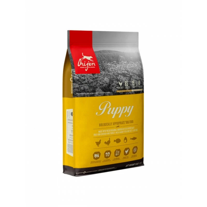 La nourriture haut de gamme Orijen se compose d’un mélange sain de viandes, de légumes, de fruits et d’herbes. Sans céréales et contenant peu de glucides, elle dispose d’une forte teneur en protéines pourr seulement 20% de glucides à faible indice glycémique afin de préserver les fonctions vitales de votre compagnon (musculature, système cardiovasculaire et immunitaire, organes). Les infusions de poulet lyophilisé et de foie de dinde rehaussent naturellement la saveur, donnant à ORIJEN un goût délicieux pour les chiots les plus difficiles.